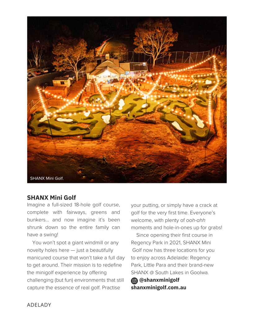 Since opening their first course in Regency Park in 2021, SHANX Mini Golf now has three locations for you to enjoy across Adelaide: Regency Park, Little Para and their brand-new SHANX @ South Lakes in Goolwa.